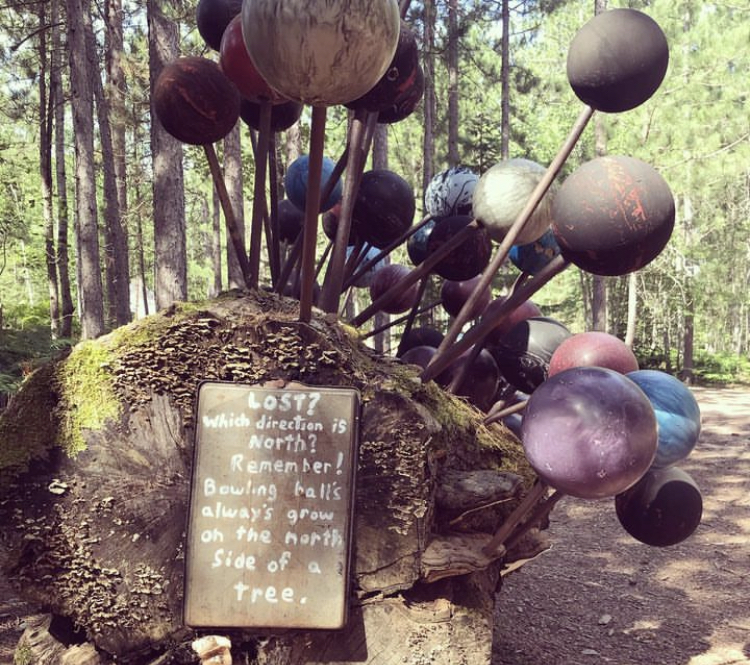 ![outdoor art exhibit from Lakenenland: wood broomsticks (with bowling balls attached to the end of each one) protrude from a large, mossy rock. A handwritten sign is attached to the rock stating “LOST? Which direction is North? Remember! Bowling ball’s alway’s [sic] grow on the north side of a tree.”](https://vilasavenue.com/wp-content/uploads/2023/04/img_4529.jpg?w=750)